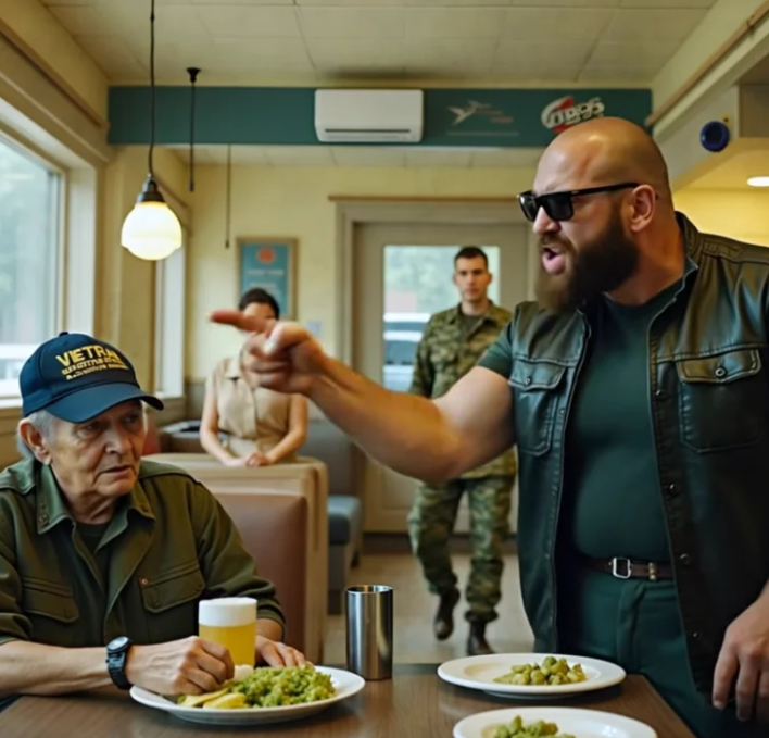 The door suddenly swung open, letting in the cool air. An imposing biker, clad in leather, entered, his boots striking the floor with force. He scanned the room, his gaze lingering on the old man’s table. “You dare, old dinosaur?” he roared. The whole diner froze — forks hovered in mid-air, whispers died away.