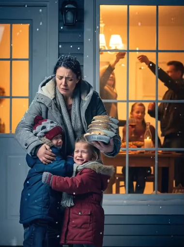 The door slammed with such finality that I actually flinched. The sound echoed in the sudden silence. Rain fell harder now, soaking through my jacket, plastering my hair to my face. I stood there like an idiot, still holding the pies, while my children cried.