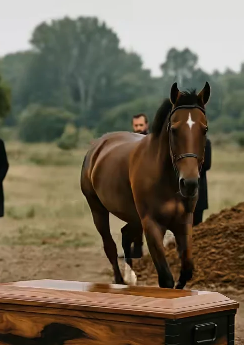 It lowered its head, let out a soft, mournful whinny — like a long, grieving call. Then it lifted one front hoof and gently tapped on the lid of the coffin.