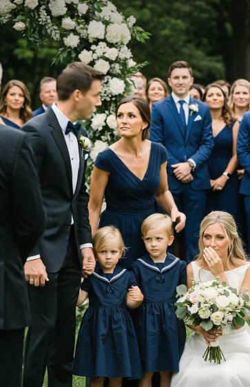 Lila entered quietly, wearing a navy-blue dress that elegantly hugged her figure. Her hair was neatly pulled back, and on either side of her were two children—one boy, one girl—both around six years old. Their faces were calm yet curious, their wide eyes observing everything with quiet wonder.