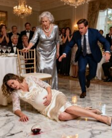 The crack of impact echoed. Elena collapsed, shock twisting her features, hands gripping her stomach. Blood stained her gown.