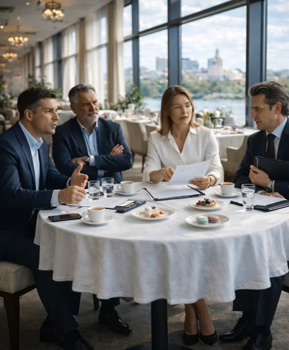 Two men were already waiting at the table: a partner and a lawyer with a folder.
